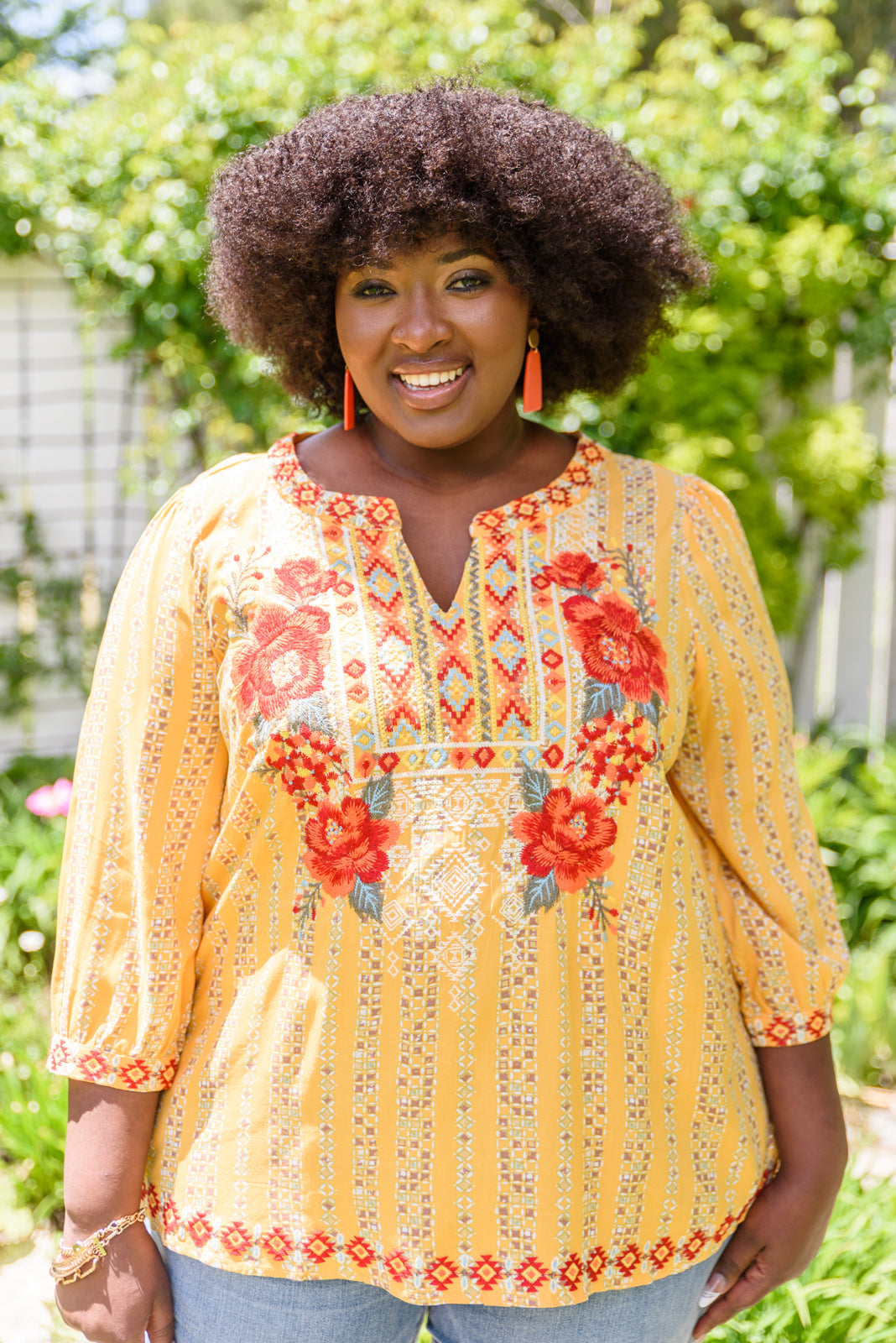 A shirt just as pretty as you! The freehand Art Shirt has details we will be infatuated with for days! Featuring a notched neckline decorated in floral embroidery that flows into an a-line silhouette, subtle balloon sleeves, and beautifully embroidered cuffs.