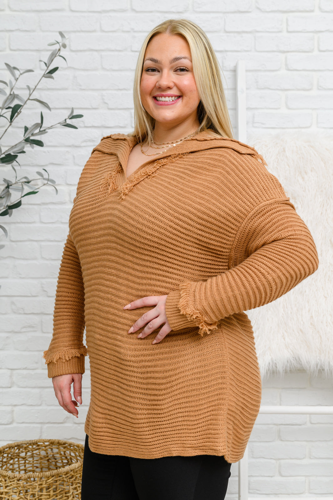 The cutest look starts with the Travel Far & Wide Sweater In Taupe! A textured ribbed knit shapes a wide collar, v-neckline that falls into slouchy long sleeves with a drop shoulder detail. A tunic length bodice has a rounded hem and subtle hi-low silhouette. Fringe trim lines the cuffs and neck for a refreshing look!