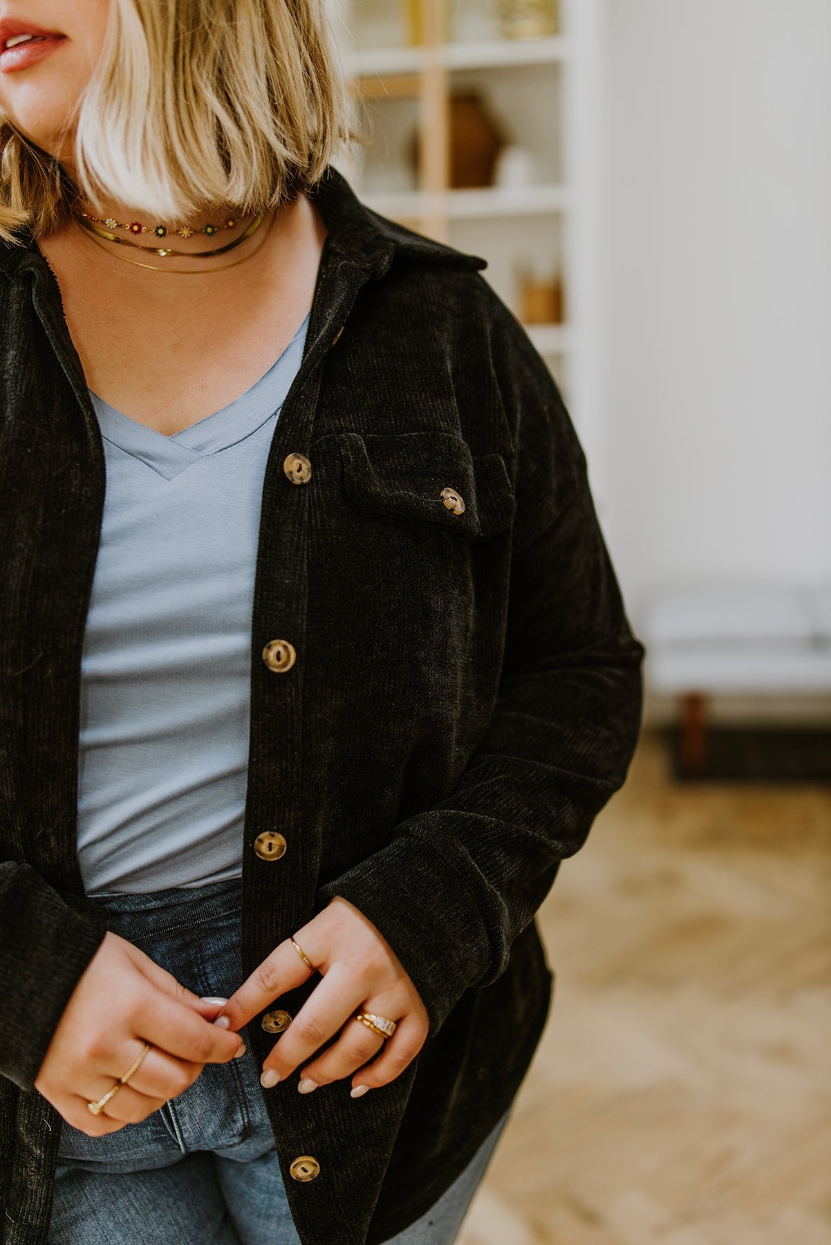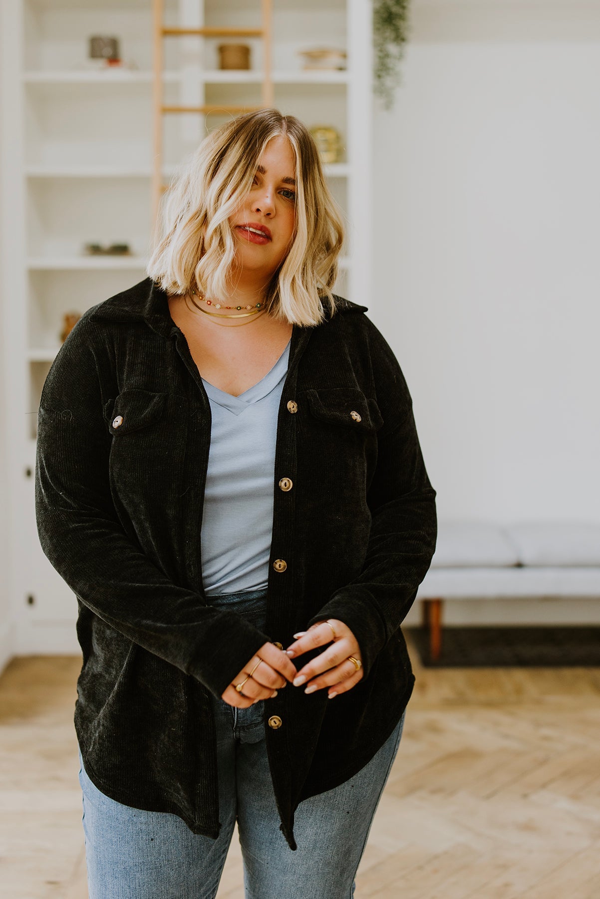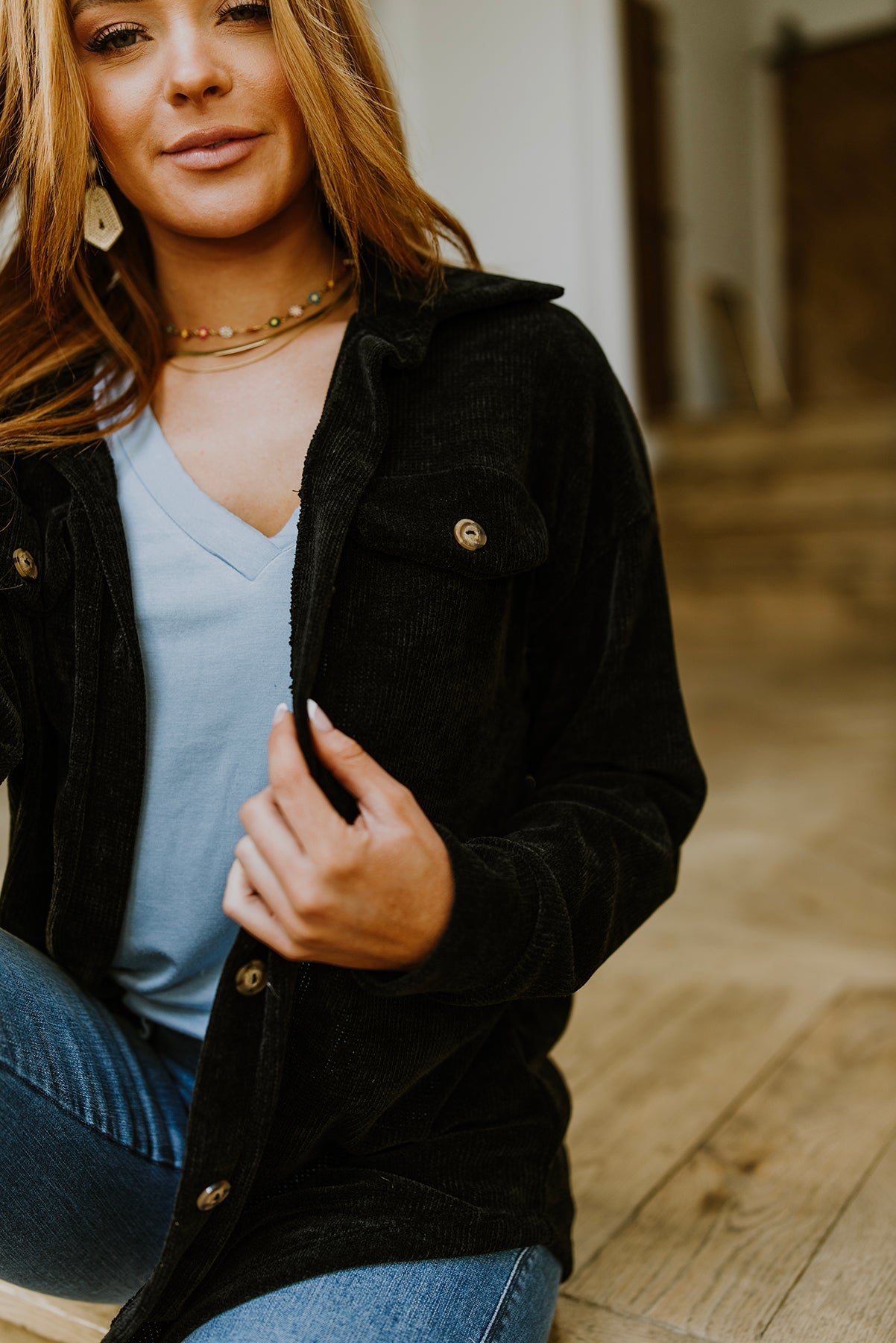 Bring comfort and style to your wardrobe with our Warm-Hearted Chenille Shacket in Black. Made from plush chenille corduroy, this shacket features a relaxed dropped shoulder and button front closure, while the pocket detail adds a touch of practicality to this must-have piece.