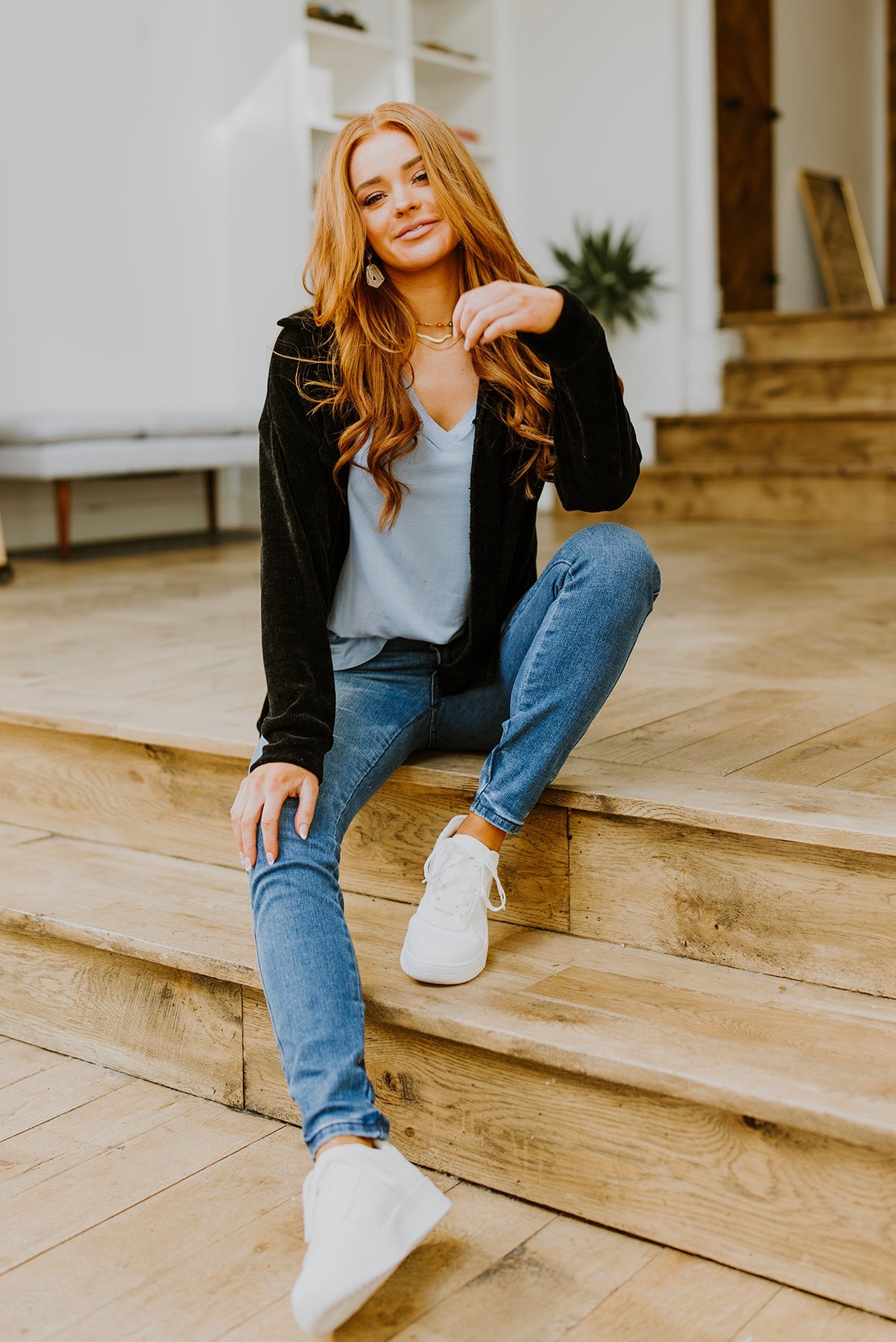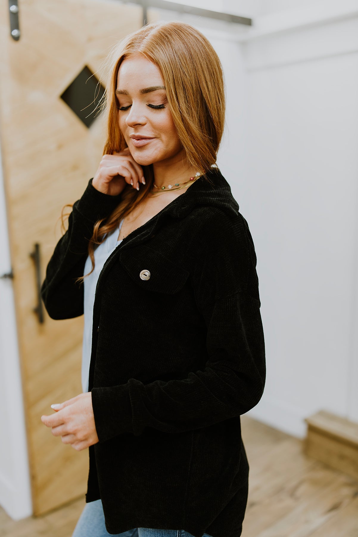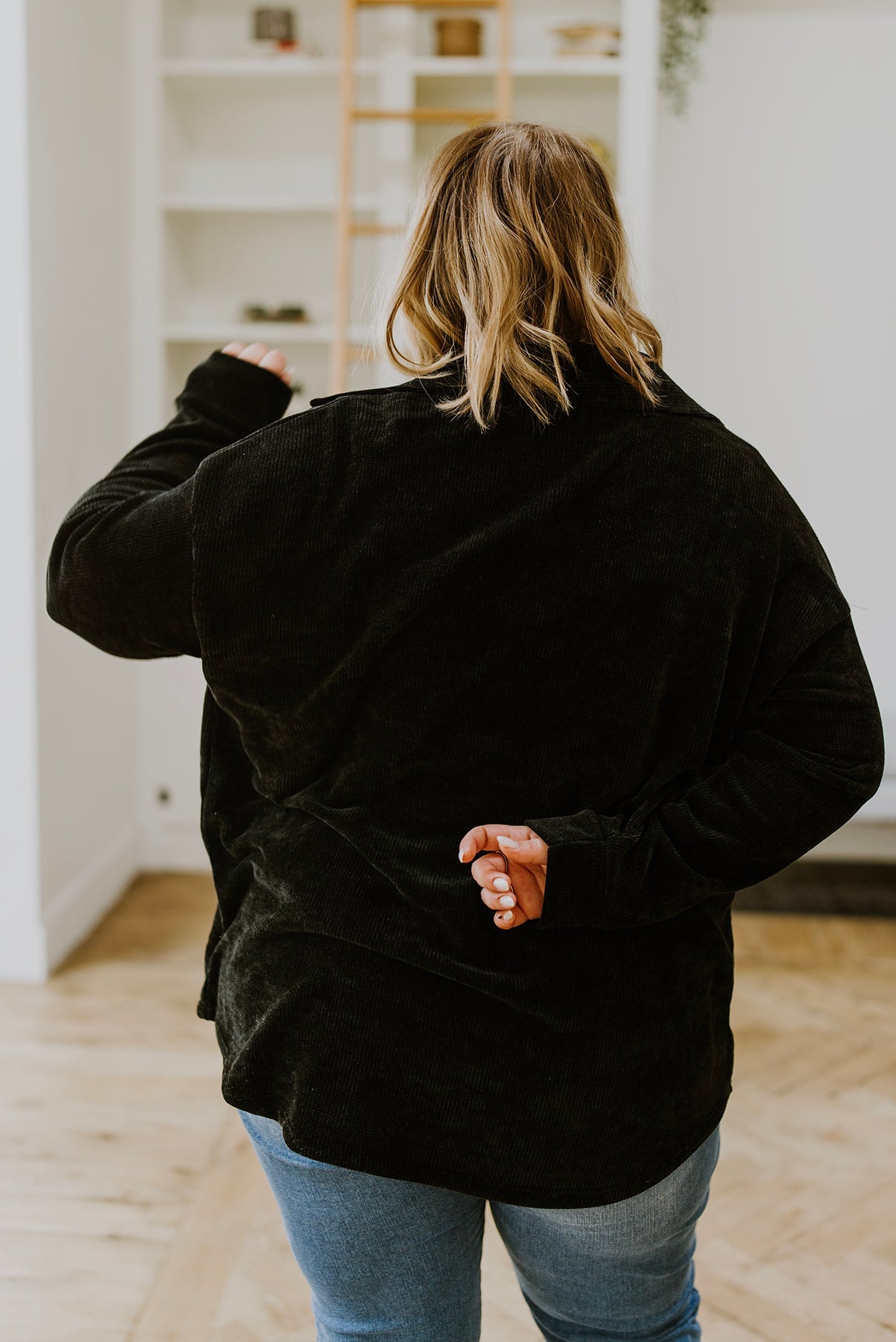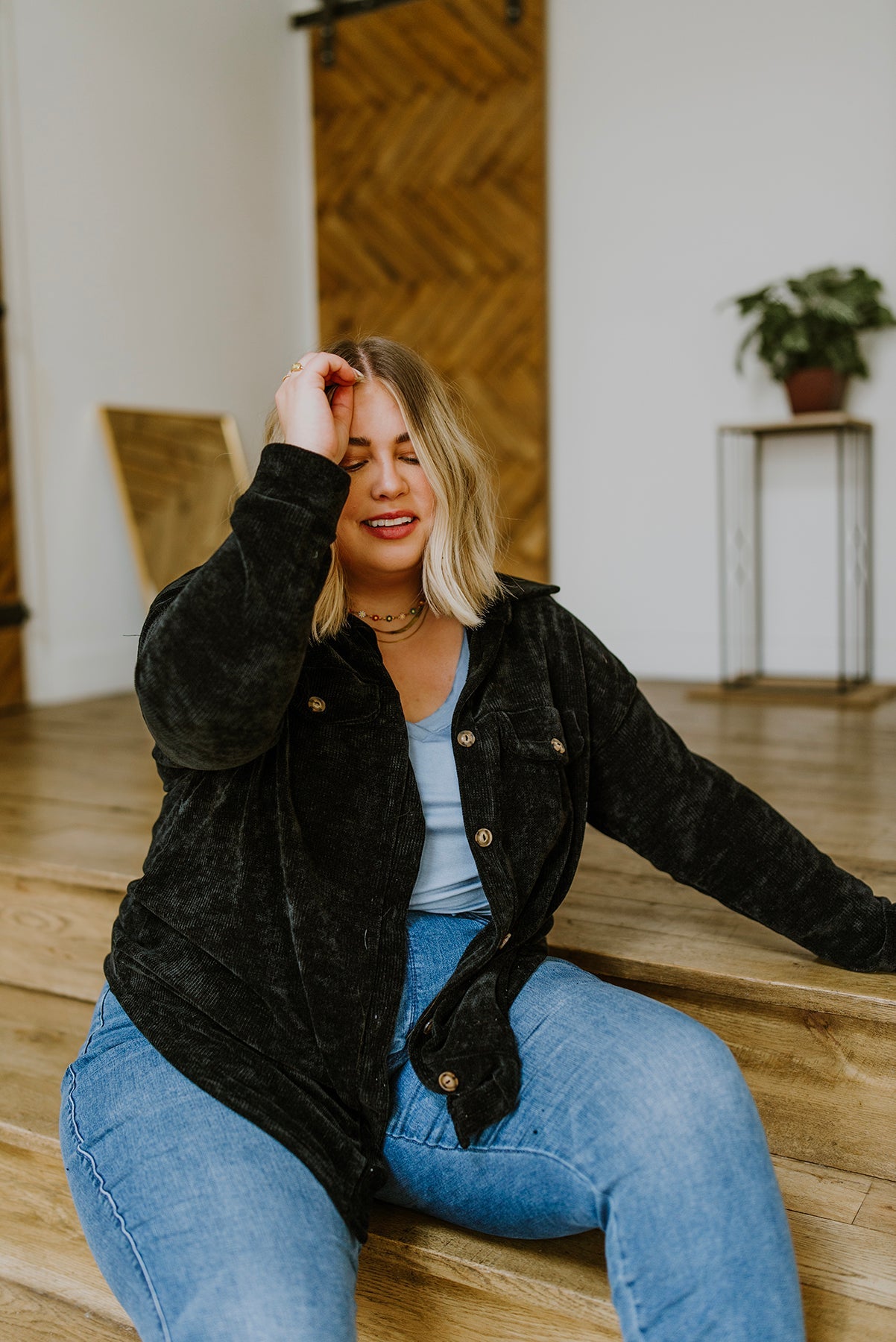 Bring comfort and style to your wardrobe with our Warm-Hearted Chenille Shacket in Black. Made from plush chenille corduroy, this shacket features a relaxed dropped shoulder and button front closure, while the pocket detail adds a touch of practicality to this must-have piece.
